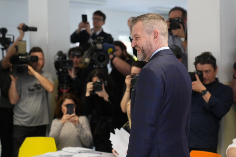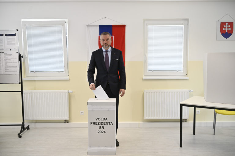 Kandidát na prezidenta SR a predseda strany HLAS - sociálna demokracia Peter Pellegrini (vľavo) počas volebného aktu v rámci 2. kola prezidentských volieb 2024. Foto: SITA/AP