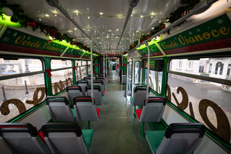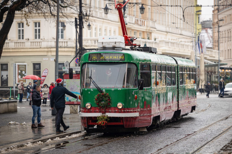 Vianočná električka počas svojho slávnostného predstavenia v uliciach hlavného mesta. Bratislava, 6. december 2023. Foto: SITA/Jana Birošová