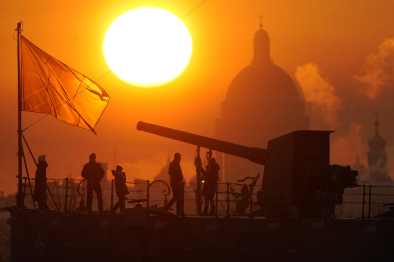 Ľudia kráčajú pri západe slnka v blízkosti dela na prednej palube krížnika Aurora kotviaceho v Petrohrade. Rusko, 6. december 2023. Foto: SITA/AP