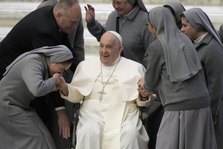 Rehoľné sestry vítajú pápeža Františka v sále pápeža Pavla VI. Vatikán, 6. december 2023. Foto: SITA/AP