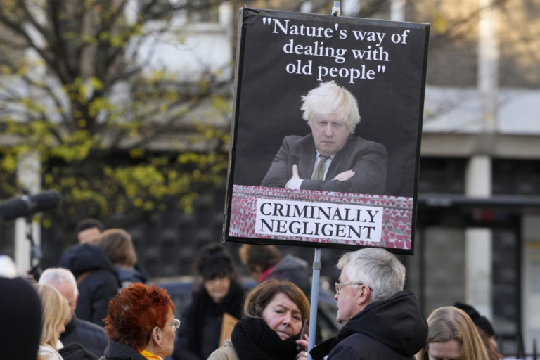 Demonštrant drží transparent s nápisom „Johnson partied while people died“ pred úradom, kde vypovedal bývalý britský premiér Boris Johnson ohľadom porušenia protipandemických opatrení. Londýn, 6. december 2023. Foto: SITA/AP