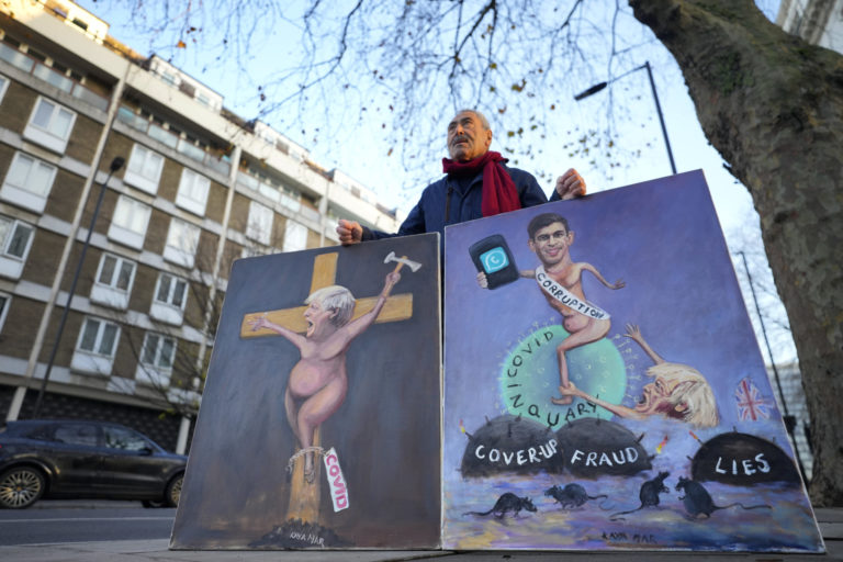Umelec Kaya Mar vystavuje svoje obrazy pred úradom, kde je vypočúvaný bývalý britský premiér Boris Johnson ohľadom porušenia protipandemických opatrení. Londýn, 6. december 2023. Foto: SITA/AP