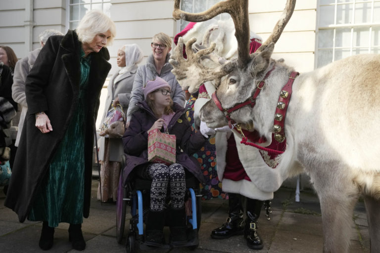 Britská kráľovná Camilla pozvala deti, aby ozdobili vianočný stromček a zároveň ich prekvapila vianočným sobom a inými darčekmi. Foto: SITA/AP