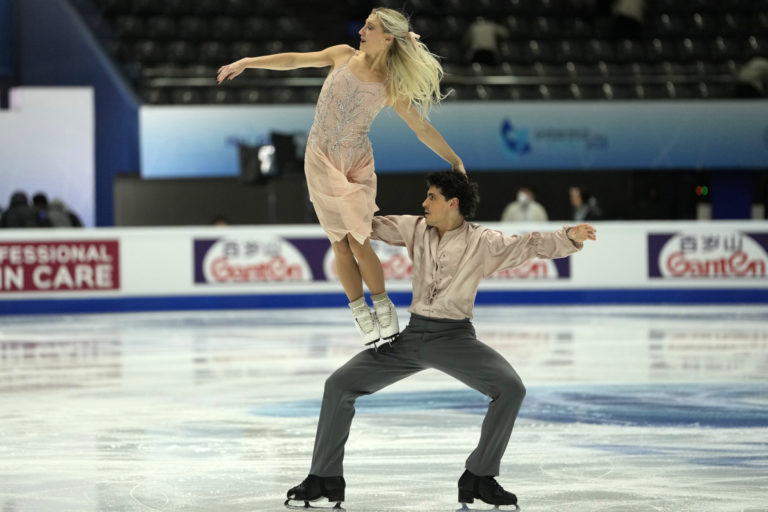 Kanaďania Piper Gilles a Paul Poirier trénujú pred Veľkou cenou krasokorčuľovania v Pekingu. Foto: SITA/AP