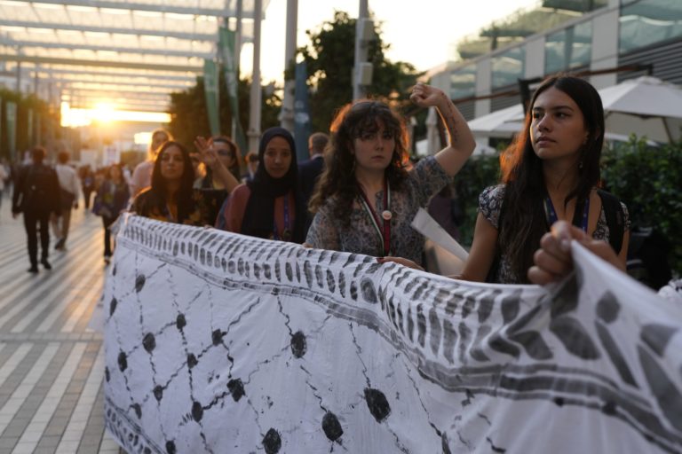 Demonštranti na proteste proti vojne medzi Izraelom a Hamasom počas klimatického summitu OSN COP28. Foto: SITA/AP