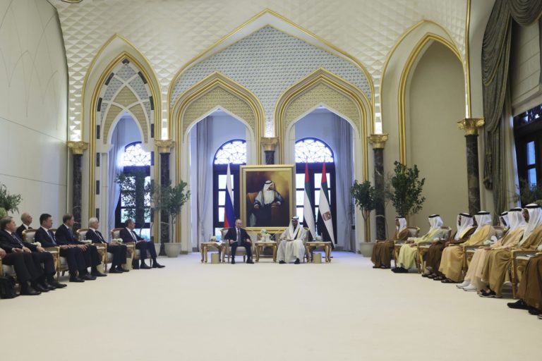 Emirátsky prezident Sheikh Mohammed bin Zayed Al Nahyan (v strede vpravo) a ruský prezident Vladimir Putin (v strede vľavo) v prezidentskom paláci Spojených arabských emirátoch. Foto: Sergei Savostyanov, Sputnik, Kremlin Pool Photo via AP