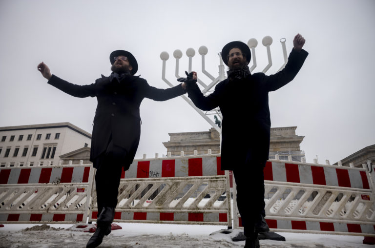 Rabín Yehuda Teichtal (vpravo) a rabín Shmuel Segal tancujú pred obrovským židovským deväťramenným svietnikom (menora). Foto: SITA/AP