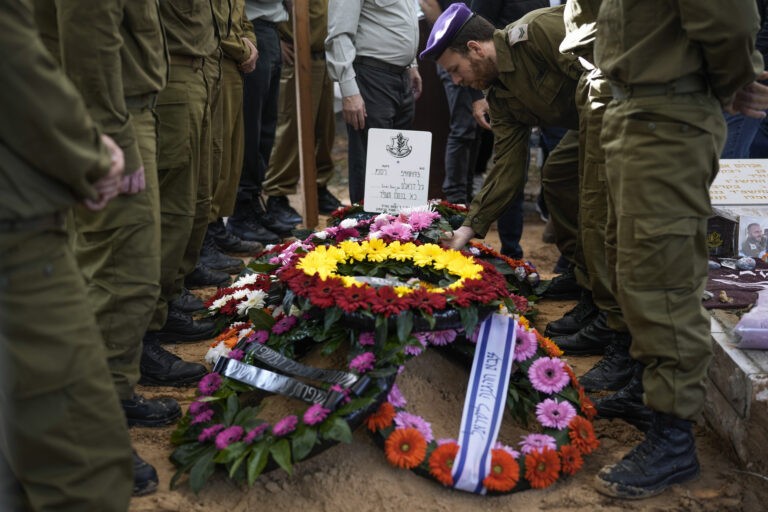 Izraelský vojak ukladá počas pohrebu vojaka na hrob veniec. Foto: SITA/AP