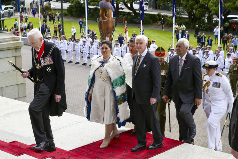 Generálna guvernérka Nového Zélandu Dame Cindy Kiro, druhá zľava, vchádza do parlamentu. Foto: Mark Mitchell/New Zealand Herald via AP