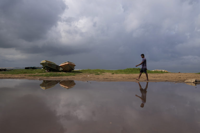 Muž kráča po pláži po daždi na Srí Lanke. Foto: SITA/AP