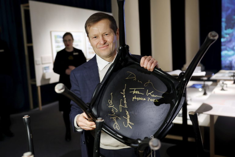Ferenc Krausz, laureát Nobelovej ceny za fyziku, podpisuje stoličku v Nobelovom múzeu v Štokholme. Švédsko, 6. decembra 2023. Foto: Christine Olsson/TT via AP