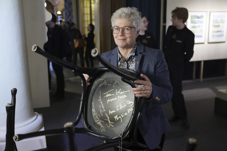 Anne L'Huillier, nositeľka Nobelovej ceny za fyziku, podpisuje stoličku v Nobelovom múzeu v Štokholme. Švédsko, 6. december 2023. Foto: Christine Olsson/TT via AP