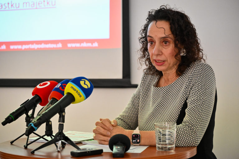 Predsedníčka Úradu pre dohľad nad zdravotnou starostlivosťou Renáta Bláhová počas tlačovej konferencie Úradu pre dohľad nad zdravotnou starostlivosťou na tému: Dôvera žaluje úrad, ten stojí v ceste výplaty dividendy vo výške 176. mil eur akcionárom Penty. Bratislava, 6. február 2024. Foto: SITA.