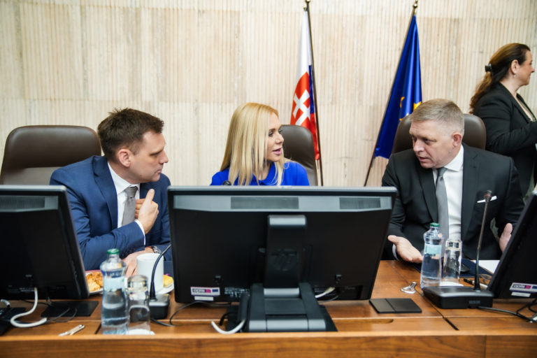 Zľava: Minister životného prostredia Tomáš Taraba, podpredsedníčka vlády a ministerka hospodárstva SR Denisa Saková a predseda vlády SR Robert Fico počas rokovania 15. schôdze vlády SR. Bratislava, 6. február 2024. Foto: SITA/Úrad vlády SR.