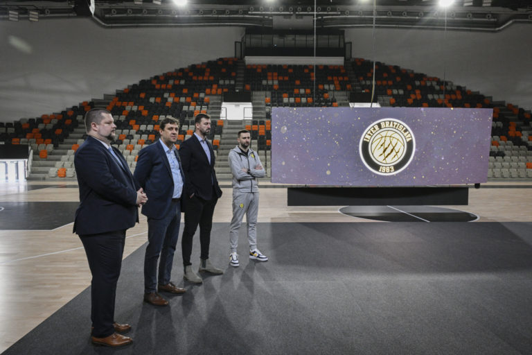 Zľava: PR manažer Slovenskej basketbalovej asociácie (SBA) Adam Solga, prezident SBA Michal Ondruš, člen výkonného výboru SBA Radoslav Rančík a tréner BK Inter Bratislava Danilo Rakočevič počas prehliadky novozrekonštruovanej športovej haly Pasienky. Bratislava, 6. február 2024. Foto: SITA/Milan Illík.