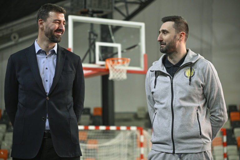 Zľava: Člen výkonného výboru Slovenskej basketbalovej asociácie (SBA) Radoslav Rančík a tréner BK Inter Bratislava Danilo Rakočevič počas prehliadky novozrekonštruovanej športovej haly Pasienky. Bratislava, 6. február 2024. Foto: SITA/Milan Illík.