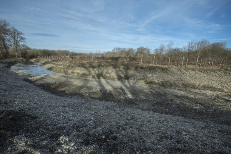 Obnovená časť riečneho Vojčianskeho ramena v Dobrohošti. Práce na obnove pozostávali z prekopania bariér a zasypaného koryta v rámci 3,7 km dlhej vetvy vodného toku, ktorá bola v minulosti v rámci vodohospodárskych úprav na viacerých miestach zasypaná a cez ktorú pôvodne tiekol Dunaj. Dobrohošť, 6. február 2024. Foto: SITA/Milan Illík.