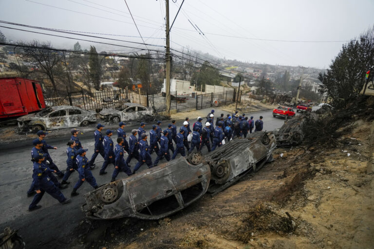 Muži čilskeho námorníctva prechádzajú okolo prevrátených, spálených áut, aby pomohli v štvrti Villa Independencia postihnutej lesnými požiarmi vo Vina del Mar v Čile. Foto: SITA/AP.