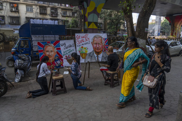 Ľudia prechádzajú ulicou Bombaja, zatiaľ čo umelci z umeleckej školy Gurukul kreslia obrazy, ktoré želajú britskému kráľovi Karolovi III. skoré uzdravenie. Foto: SITA/AP.