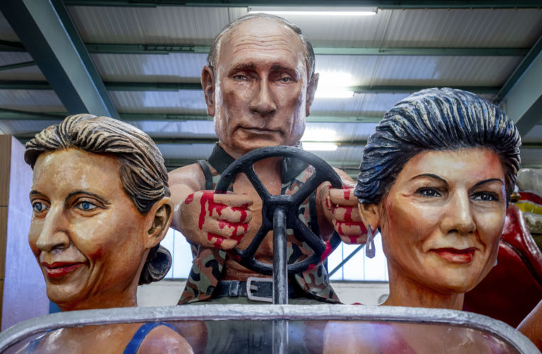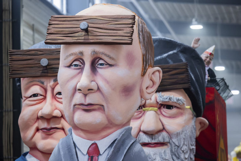 Masky Vladimira Putina, čínskeho prezidenta Si Ťin-pchinga (vľavo) a iránskeho náboženského vodcu Ajatolláha Alího Chameneía na karnevale v nemeckom Kolíne. Foto: Rolf Vennenbernd/dpa via AP.