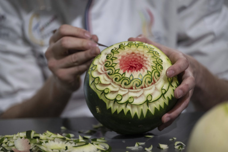 Účastníčka súťaže vo vyrezávaní do ovocia a zeleniny na „IKA/Kulinárskej olympiáde“ v nemeckom Stuttgarte. Foto: Marijan Murat/dpa via AP.