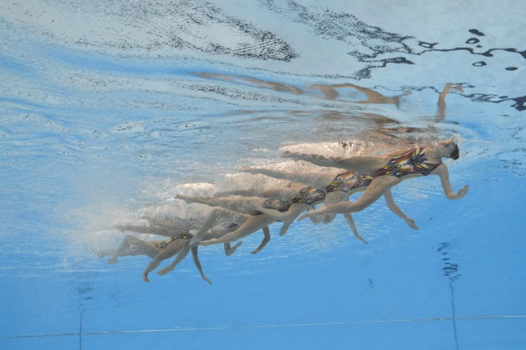 Slovenský tím súťaží vo finále umeleckého plávania zmiešaných družstiev na majstrovstvách sveta vo vodnom športe v katarskej Dauhe. Foto: SITA/AP.