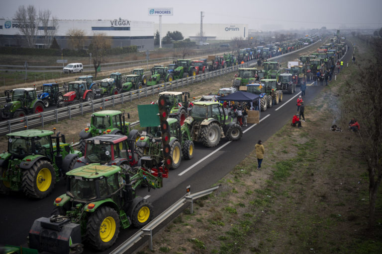 Zaparkované traktory blokujú diaľnicu počas protestu farmárov neďaleko Mollerussa na severovýchode Španielska. Foto: SITA/AP.