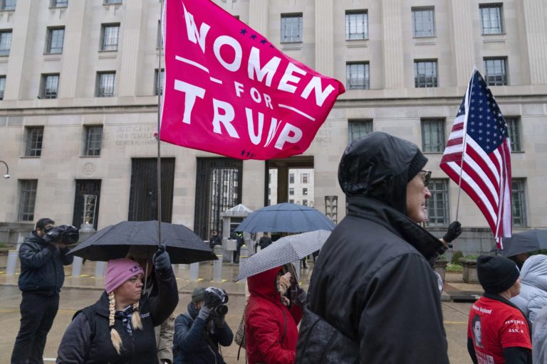 Stúpenci exprezidenta Donalda Trumpa počas protestu pred ministerstvom spravodlivosti na tretie výročie útoku na Kapitol. Foto: SITA/AP.