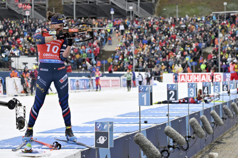 Francúzska biatlonistka Julia Simonová počas pretekov na 10 km v nemeckom Oberhofe. Foto: Martin Schutt/dpa via AP.