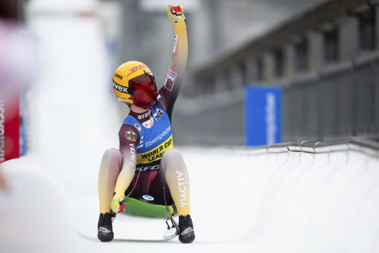 Nemka Julia Taubitzová sa teší z druhého miesta v pretekoch Svetového pohára vo Winterbergu. Foto: Marius Becker/dpa via AP.