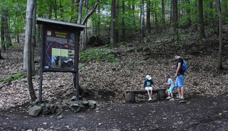 Informačné tabule v okolí Zbojníckeho hradu. Zbojnícky hrad, nazývaný často aj ako Soľnohrad alebo Soľný hrad, je hradná zrúcanina na vyvýšenine Slanských vrchov nad obcou Ruská Nová Ves. Ruská Nová Ves, 29. jún 2024. Foto: SITA/Viktor Zamborský