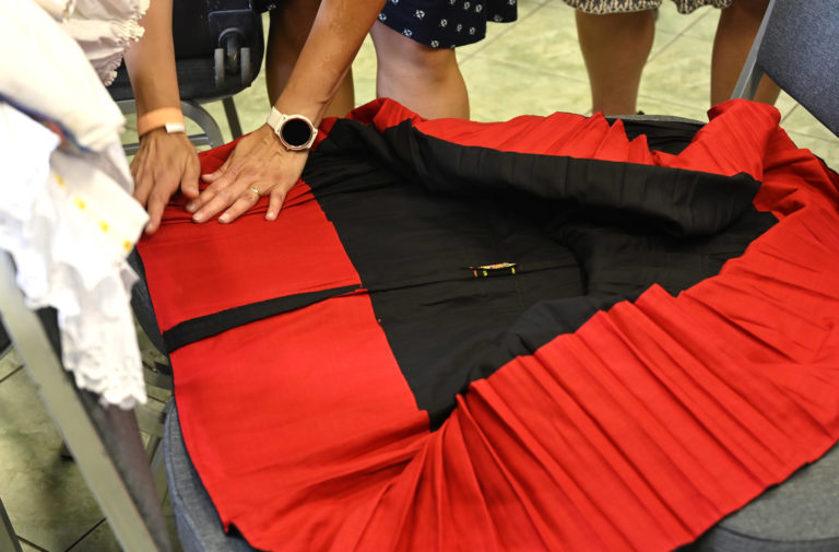 Andrea Šuleková ukazuje ukladanie kroja do truhly alebo kufra počas metodického podujatia s praktickými ukážkami ako sa správne starať o kroje pri príležitosti 69. ročníka Folklórneho festivalu Východná. Východná, 6. júl 2024. Foto: SITA/Viktor Zamborský