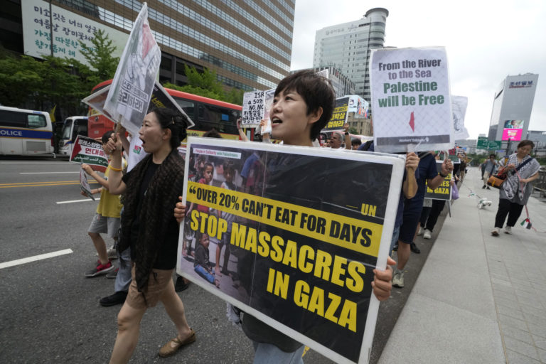 Demonštranti podporujúci Palestínčanov počas zhromaždenia vyzývajúceho na zastavenie genocídy v Gaze. Foto: SITA/AP