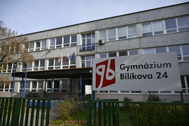 Gymnázium Bilíkova v Bratislave počas stretnutia zástupcov Jednoty dôchodcov na Slovensku a Študentskej rady stredných škôl na Gymnáziu Bilíkova v Bratislave na tému: Diskusia o situácii, ktorá vznikla počas uplynulých dní, keď súťaž halloweenskych kostýmov vyhrala skupina žiakov oblečených za dôchodcov, držiac pri tom politické transparenty. Bratislava, 6. november 2024. Foto: SITA/Milan Illík