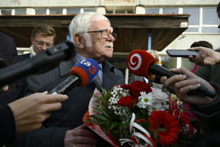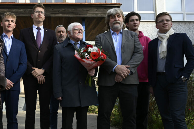 Predseda Jednoty dôchodcov na Slovensku (JDS) Michal Kotian (v popredí) počas brífingu s novinármi v rámci stretnutia zástupcov Jednoty dôchodcov na Slovensku a Študentskej rady stredných škôl na Gymnáziu Bilíkova na tému: Diskusia o situácii, ktorá vznikla počas uplynulých dní, keď súťaž halloweenskych kostýmov vyhrala skupina žiakov oblečených za dôchodcov, držiac pri tom politické transparenty. Bratislava, 6. november 2024. Foto: SITA/Milan Illík