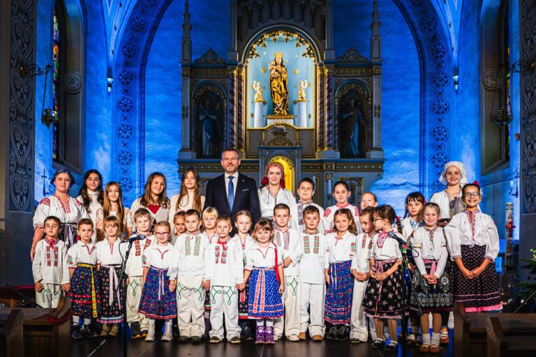 Prezident SR Peter Pellegrini (v pozadí šiesty zľava) počas slávnostného otvorenia Vianočnej pošty 2024 a uvedenia známky do života v Bazilike Narodenia Panny Márie v Rajeckej Lesnej. Rajecká Lesná, 6. november 2024. Foto: SITA/Kancelária prezidenta SR