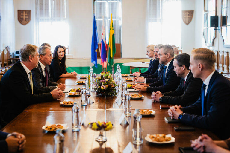 Uprostred sprava: Prezident SR Peter Pellegrini a primátor mesta Žilina Peter Fiabáne počas stretnutia v rámci rokovania v Žiline pri príležitosti návštevy prezidenta SR v Žilinskom samosprávnom kraji. Žilina, 6. november 2024. Foto: SITA/Kancelária prezidenta SR