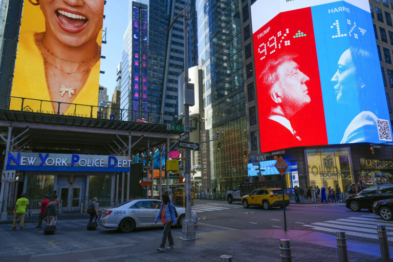 Tváre Donalda Trumpa a Kamaly Harrisovej na obrazovkách na Times Square. Foto: SITA/AP