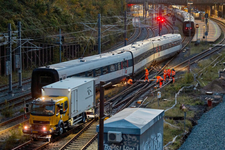 Vlaková doprava pozastavená z dôvodu vykoľajeného vlaku na železničnej stanici Aarhus v dánskom Aarhuse. Dánsko, 6. októbra 2025. Foto: (Mikkel Berg Pedersen/Ritzau Scanpix via AP)