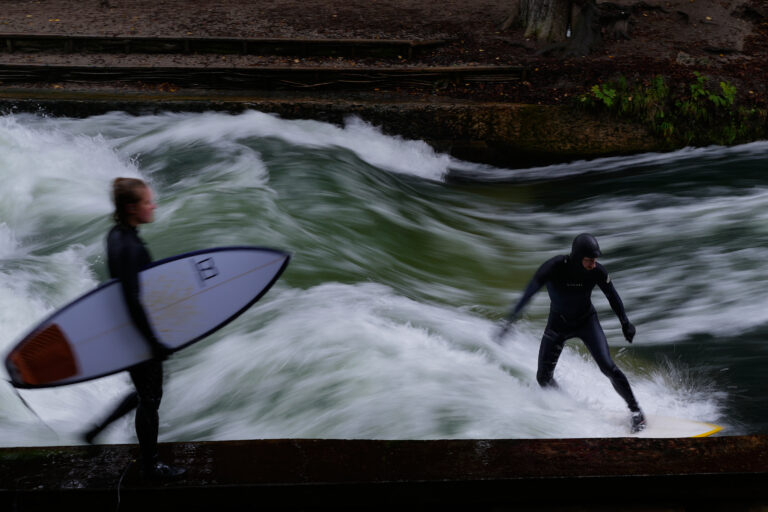 Surferská jazda na umelej vlne v rieke Eisbach v centre Mníchova. Nemeck, 6. októbra 2025. Foto: (AP Photo/Matthias Schrader)