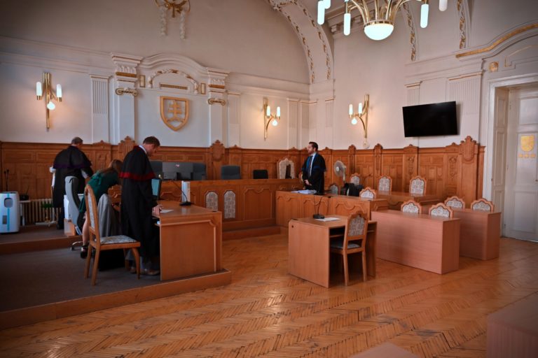 Obhajca obvineného Jána Slotu Roman Hriadeľ (vpravo) počas hlavného pojednávania s expolitikom Jánom Slotom na Špecializovanom trestnom súde v Banskej Bystrici. Banská Bystrica, 6. september 2024. Foto: SITA/Jakub Julény