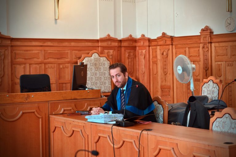 Obhajca obvineného Jána Slotu Roman Hriadeľ počas hlavného pojednávania s expolitikom Jánom Slotom na Špecializovanom trestnom súde v Banskej Bystrici. Banská Bystrica, 6. september 2024. Foto: SITA/Jakub Julény