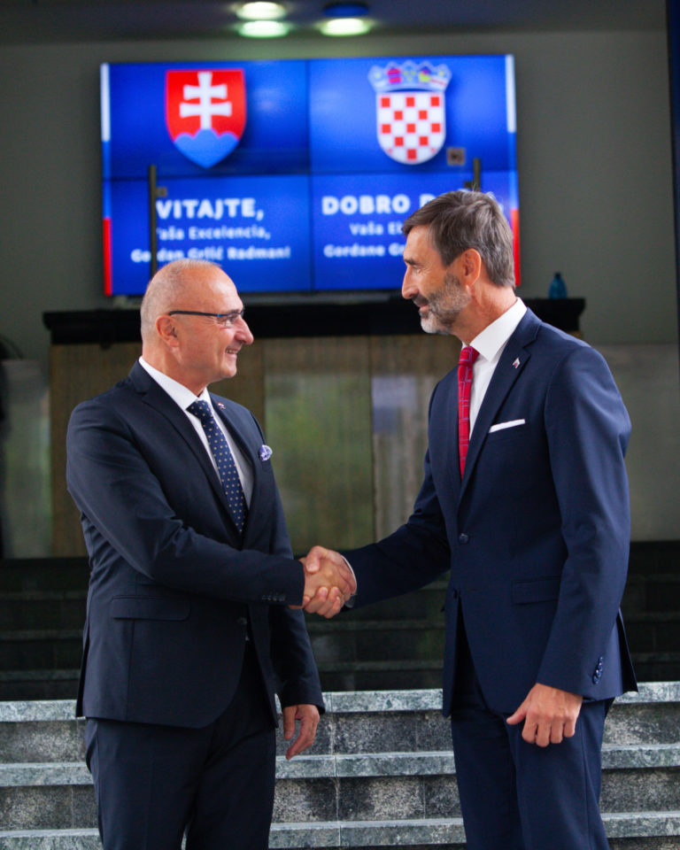 Zľava: Minister zahraničných vecí a európskych záležitostí Chorvátskej republiky Gordan Grlić Radman a minister zahraničných vecí a európskych záležitostí Slovenskej republiky Juraj Blanár počas prijatia pred rokovaním v priestoroch MZVEZ SR v rámci oficiálnej návštevy ministra zahraničných vecí Chorvátska na Slovensku. Bratislava, 6. september 2024. Foto: SITA/ Tomáš Bokor