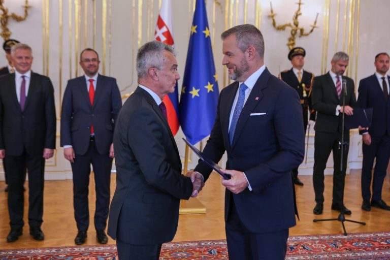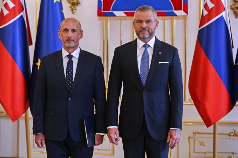 Zľava: Veľvyslanec a vedúci Stálej misie SR pri OSN Peter Hulény a prezident SR Peter Pellegrini počas odovzdávania poverovacích listín dezignovaným veľvyslancom prezidentom SR v Prezidentskom paláci. Bratislava, 6. september 2024. Foto: SITA/Tomáš Susko