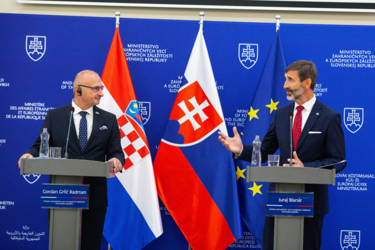 Zľava: Minister zahraničných vecí a európskych záležitostí Chorvátskej republiky Gordan Grlić Radman a minister zahraničných vecí a európskych záležitostí Slovenskej republiky Juraj Blanár počas tlačovej konferencie po rokovaní v priestoroch MZVEZ SR v rámci oficiálnej návštevy ministra zahraničných vecí Chorvátska Gordana Grlića Radmana na Slovensku. Bratislava, 6. september 2024. Foto: SITA/ Tomáš Bokor
