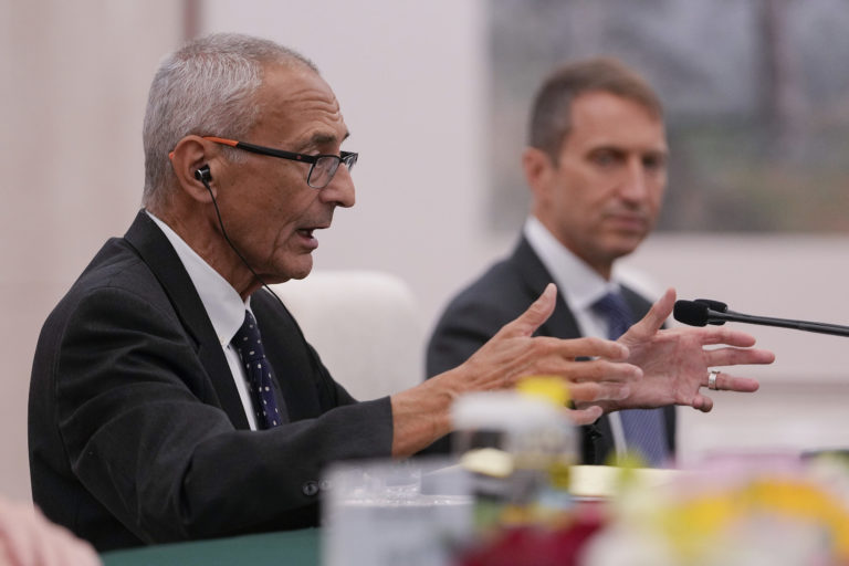 Hlavný poradca Bieleho domu a vyslanec pre klímu John Podesta (vľavo) počas bilaterálneho stretnutia s čínskym ministrom zahraničných vecí Wang I. Foto: SITA/AP