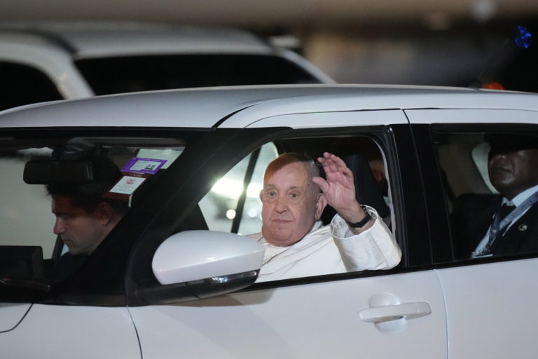 Pápež František pri odchode z medzinárodného letiska Jackson's v Port Moresby v Papue-Novej Guinei. Foto: SITA/AP