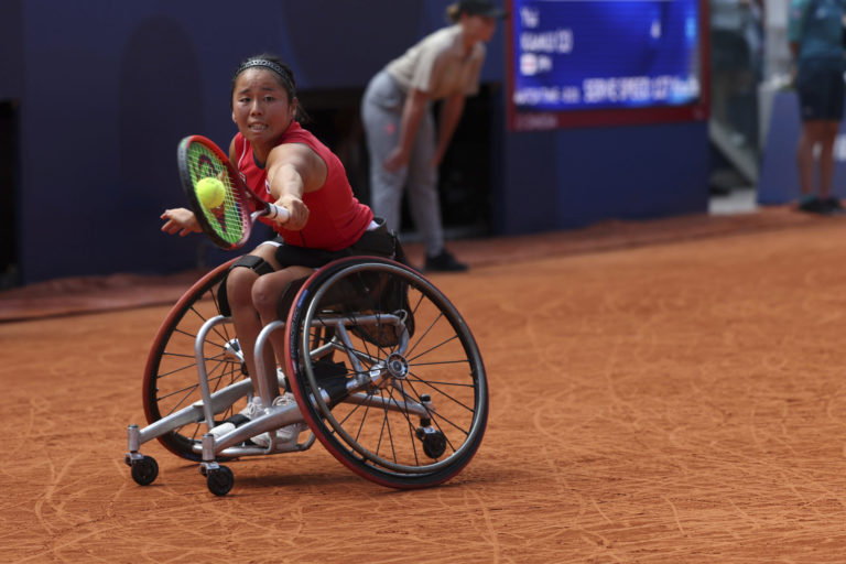Japonka Yui Kamijiová počas zápasu o zlatú medailu v ženskej dvojhre na paraolympiáde 2024. Foto: SITA/AP