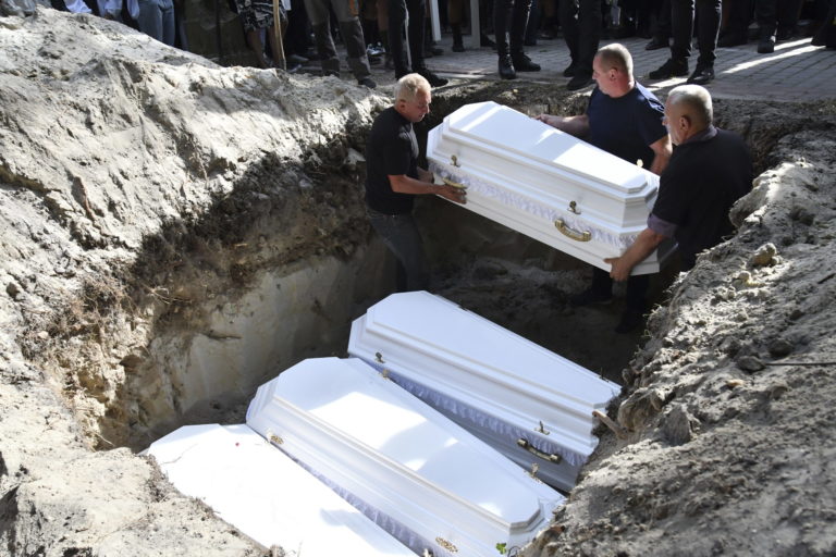 Muži ukladajú rakvy členov rodiny Jaroslava Bazylevyča na mestskom cintoríne v ukrajinskom Ľvove. Foto: SITA/AP