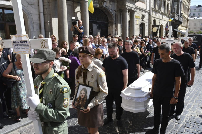 Ľudia nesú rakvy členov rodiny Jaroslava Bazylevyča počas pohrebného sprievodu v ukrajinskom Ľvove. Foto: SITA/AP